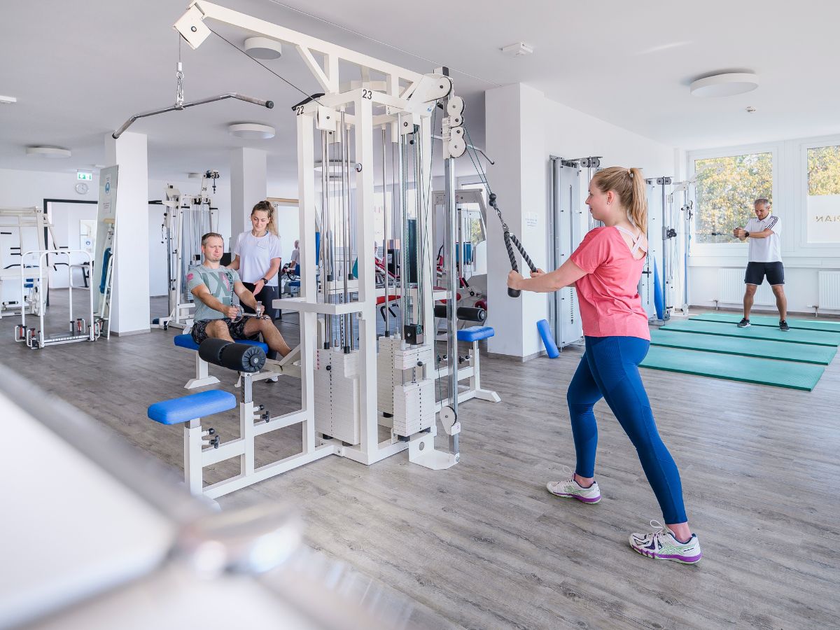 ein ärztlich überwachtes, individuell angepasstes Bewegungsprogramm (z. B. Ergometer-Training, Outdoor-Sportgruppe, Yoga, gymnastische Übungen, Kräftigungstraining)