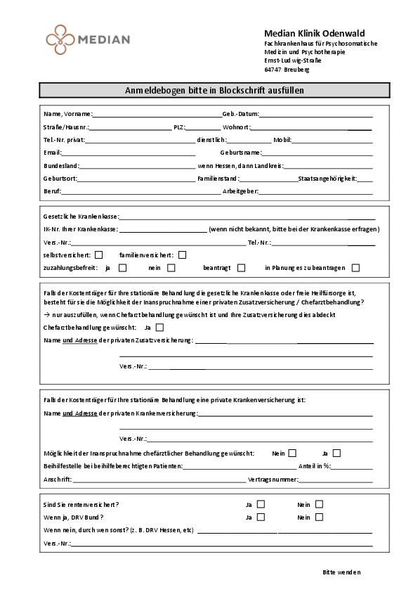 Wenn Sie sich für eine Behandlung in unserem Fachkrankenhaus interessieren, sprechen Sie zunächst mit Ihrem behandelnden Haus- oder Facharzt darüber. Er wird die Indikation für eine stationäre akutpsychosomatische Behandlung stellen und Ihnen eine Krankenhauseinweisung („Verordnung von Krankenhausbehandlung“, rosa Schein) ausstellen. Bitte beachten: Oben rechts auf Ihrer Einweisung gibt es ein Feld „Nächsterreichbare, geeignete Krankenhäuser“. Dieses Feld muss ausgefüllt sein. Hier sollte entweder ganz allgemein „Psychosomatische Klinik“ oder direkt „MEDIAN Klinik im Odenwald“ stehen.