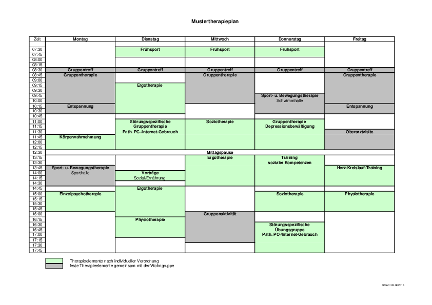 Das Behandlungsprogramm umfasst Einzel- und vor allem Gruppenpsychotherapien. Von besonderer Bedeutung ist die störungsspezifische Gruppentherapie zum pathologischen PC-/Internetgebrauch, die durch spezifische bewegungs-, ergo- und soziotherapeutische Elemente sowie durch physikalische Therapie und Ernährungsberatung ergänzt wird.