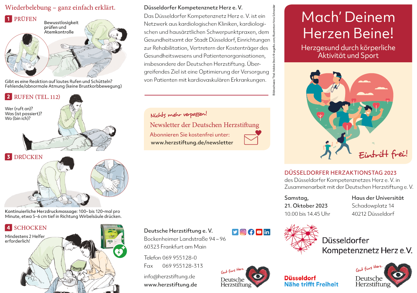 Das Düsseldorfer Kompetenznetz Herz e.V. verfolgt die Optimierung der Versorgung von Patienten mit kardiovaskulären Erkrankungen. Anlässlich zu diesem Thema läd das Düsseldorfer Kompetenznetzwerk e.V. in Zusammenarbeit mit der Deutschen Herzstiftung e.V. am Samstag den 21.10.2023 von 10:00 Uhr bis 14:45 Uhr zum Haus der Universität am Schadowplatz 14 in 40212 Düsseldorf ein. Wir freuen uns das unsere Oberärztin Frau Dr. Barbara Bellmann dort einen Vortrag passend zum Thema Herzugesundheit halten wird.