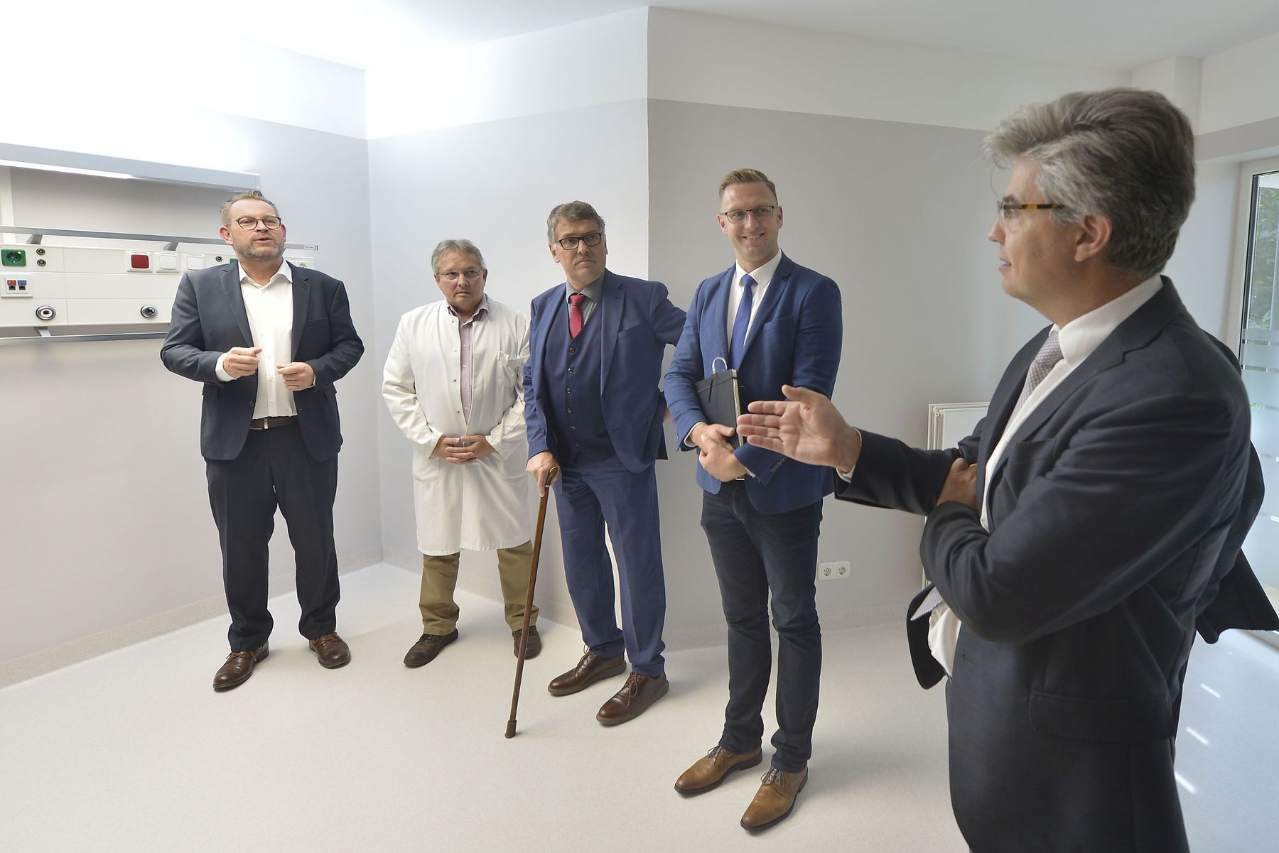 Bildzeile: Vorstellung der neuen Station in der MEDIAN Heinrich-Mann-Klinik Bad Lieben-stein mit v.l.: Martin Kubiessa (Kaufmännischer Leiter), Dr. Jürgen Eiche (Chefarzt), Land-rat Reinhard Krebs, Bernd Rosenstengel (Beigeordneter des Wartburgkreises), Dr. André M. Schmidt (CEO von MEDIAN), Foto: MEDIAN