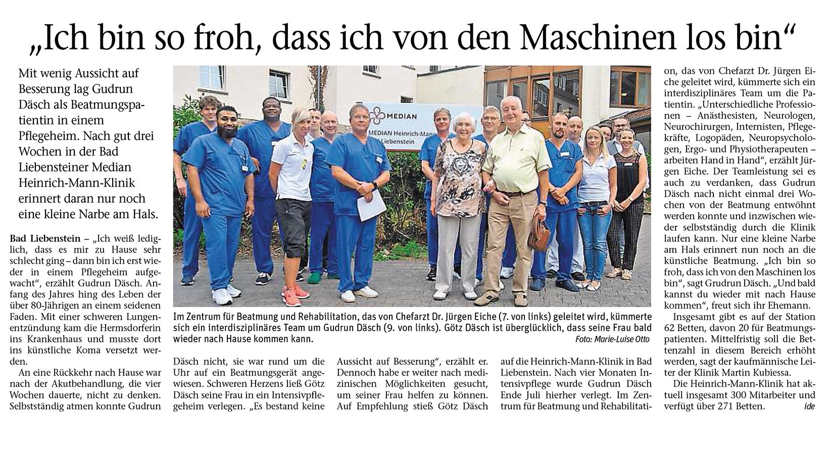 In diesem Artikel der Südthüringer Landeszeitung wird von der erfolgreichen Behandlung einer Patientin in der MEDIAN Heinrich-Mann-Klinik Bad Liebenstein berichtet, die als Beatmungspatientin aus einem Pflegeheim kam und jetzt wieder selbständig durch die Klinik laufen kann. Die Veröffentlichung erfolgt mit freundlicher Genehmigung der Südthüringer Landeszeitung.