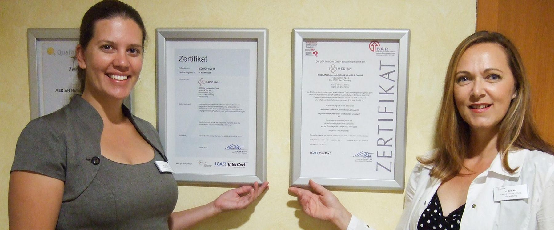 Eine intensive Vorbereitung über mehrere Monate und insgesamt drei Tage Prüfung liegen hinter der MEDIAN Hohenfeld-Klinik in Bad Camberg. Mit großer Freude konnte die Kaufmännische Leiterin Heike Baecker jetzt die Urkunde der bestandenen Zertifizierung in Empfang nehmen. Sie bescheinigt der Klinik ein Qualitätsmanagement auf hohem Niveau und neuestem Stand. „Ein großes Dankeschön an alle Mitarbeiterinnen und Mitarbeiter, die sich bei der Vorbereitung und während des Audits als Team so stark engagiert haben“, so Baecker. „Die Auditoren haben die Offenheit und die Motivation unserer Mitarbeiterinnen und Mitarbeiter ausdrücklich gelobt.“