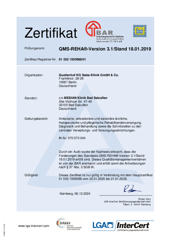 Die MEDIAN Klinik am Burggraben in Bad Salzuflen ist zertifiziert gemäß dem Zertifizierungsverfahren QMS-Reha 3.1 und DIN EN ISO 9001:2015.