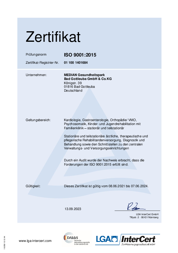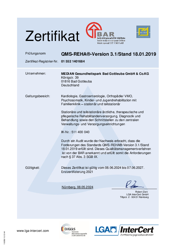 Die Rehabilitationsklinik Bad Gottleuba steht für höchste medizinische Kompetenz, moderne Therapiekonzepte und eine konsequente Orientierung an den Bedürfnissen unserer Patientinnen und Patienten. Um die Qualität unserer Arbeit transparent zu machen und kontinuierlich zu verbessern, lassen wir uns regelmäßig durch unabhängige Fachgesellschaften und Institutionen prüfen und zertifizieren.