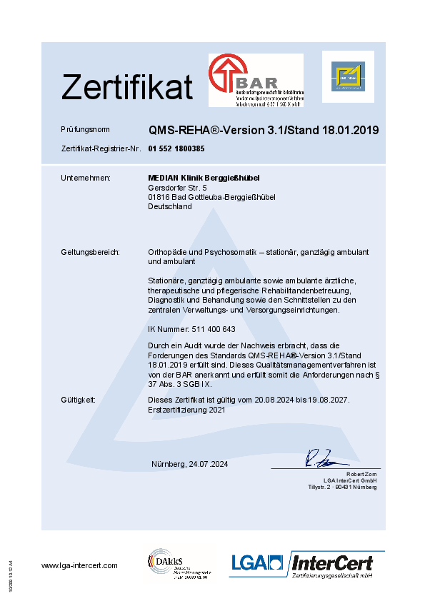 In der MEDIAN Klinik Berggießhübel wird erstklassige Arbeit geleistet. Sowohl die Therapie, ärztliche Betreuung und Pflege als auch die Unterbringung werden höchsten Qualitätsansprüchen gerecht. Das können die vielen zufriedenen Patienten bestätigen. Doch die Klinik will ihre Leistungen transparent und neutral nach außen dokumentieren. Dazu stellt sie sich regelmäßig den Anforderungen des modernen Qualitätsmanagements und den Überprüfungen durch unabhängige Fachleute. So sind wir zur Optimierung unserer Arbeitsabläufe nach QMS Reha und DIN ISO 9001:2015 zertifiziert.