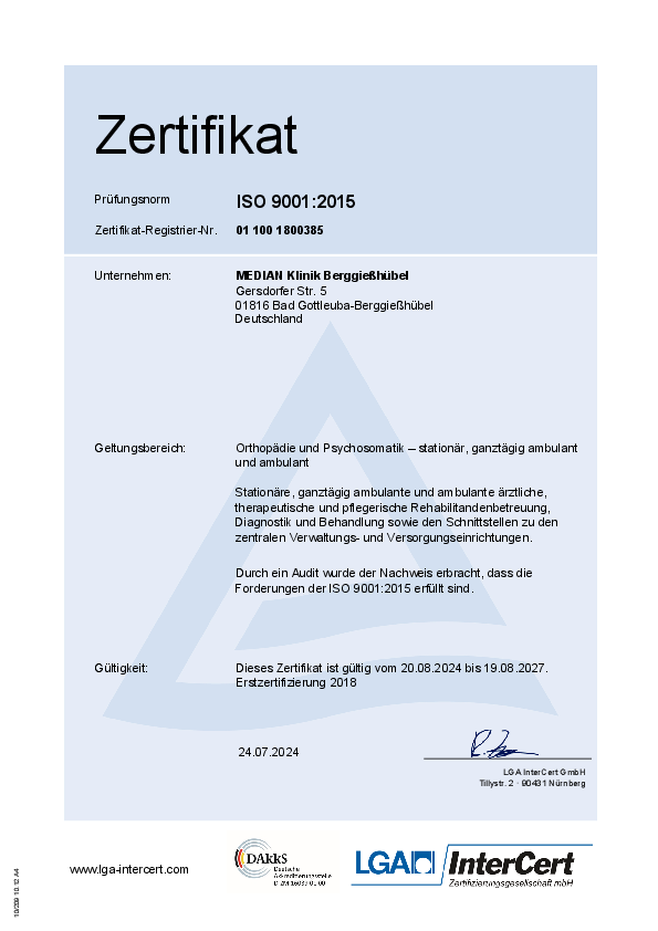 In der MEDIAN Klinik Berggießhübel wird erstklassige Arbeit geleistet. Sowohl die Therapie, ärztliche Betreuung und Pflege als auch die Unterbringung werden höchsten Qualitätsansprüchen gerecht. Das können die vielen zufriedenen Patienten bestätigen. Doch die Klinik will ihre Leistungen transparent und neutral nach außen dokumentieren. Dazu stellt sie sich regelmäßig den Anforderungen des modernen Qualitätsmanagements und den Überprüfungen durch unabhängige Fachleute. So sind wir zur Optimierung unserer Arbeitsabläufe nach QMS Reha und DIN ISO 9001:2015 zertifiziert.