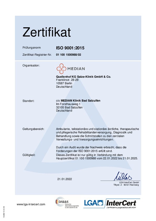 Die MEDIAN Klinik Flachsheide Bad Salzuflen ist zertifiziert gemäß dem Zertifizierungsverfahren QMS-Reha 3.1 und der DIN EN ISO 9001:2015.