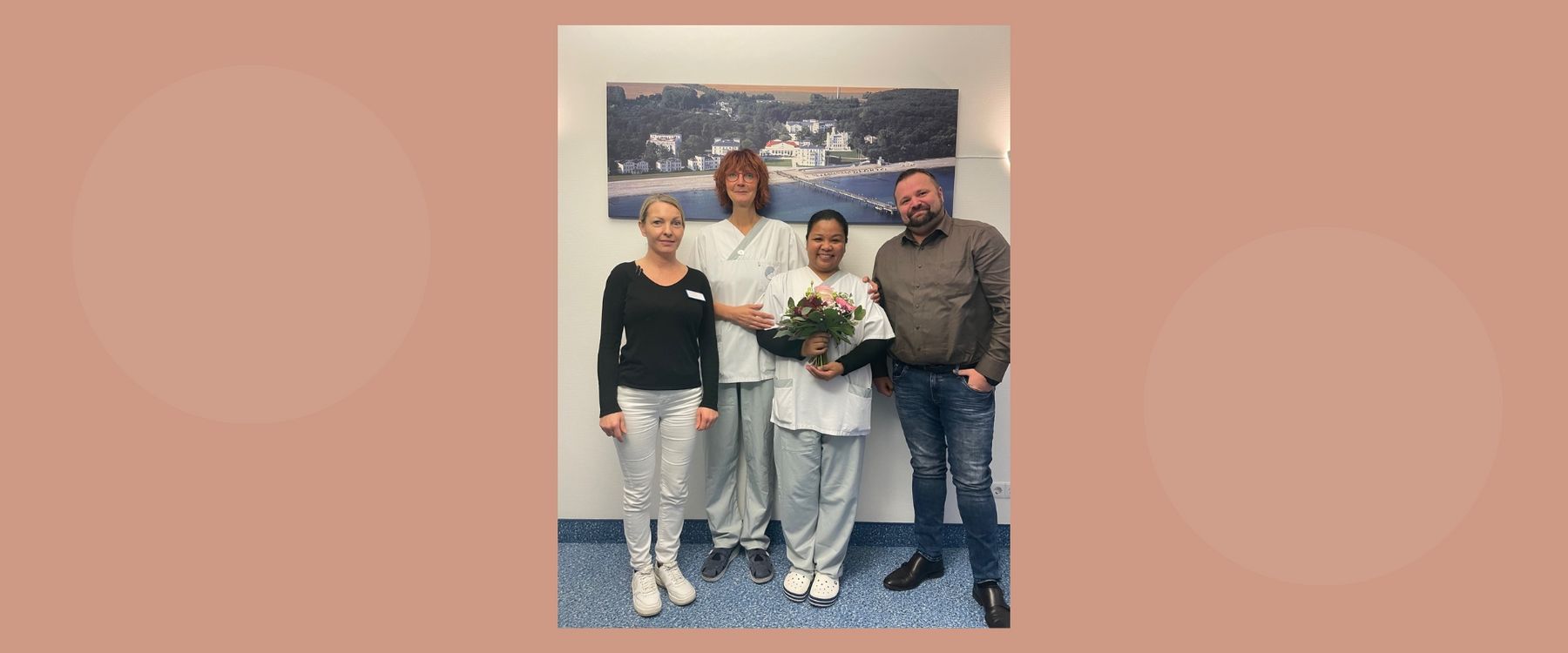 Frau Quebalayan kam am 24. November 2023 als erste Pflegekraft von den Philippinen in die MEDIAN Klinik Heiligendamm und unterstützte seitdem engagiert als Pflegeassistentin die Abteilungen Pulmologie und Psychosomatik. Ein Jahr später, am 20. November 2024, legte sie erfolgreich ihre Anerkennungsprüfung ab. Seit dem 9. Dezember 2024 ist sie offiziell als Pflegefachkraft in der Klinik tätig.