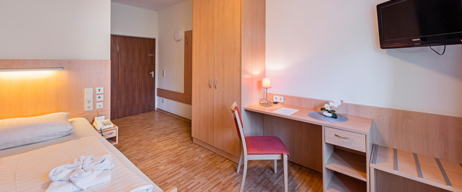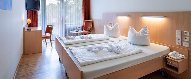 Unsere 534 Zimmer verfügen über ein Bad mit Dusche, Telefonanschluss und TV. Alle Zimmer verfügen über einen Balkon mit Blick auf die Mittelbergslandschaft, oder den Teich, bzw. Bach am Haus. Alle unsere Zimmer sind behindertenfreundlich, 23 Zimmer sind rollstuhlgerecht.