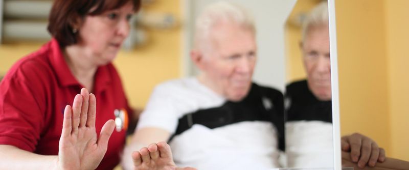 Eine andere Form die Hirnareale, die für die Bewegung des gelähmten Armes zuständig sind, anzuregen ist die Spiegeltherapie. Der Patient sitzt an einem Tisch, vor ihm steht ein Spiegel, in den er von der Seite schaut. Die gesunde Hand ist auf der Seite, die im Spiegel gesehen werden kann. Wenn der Patient nun Bewegungen mit der gesunden Hand ausübt und dabei in den Spiegel schaut, dann sieht es für ihn so aus, als würde sich die linke Hand bewegen. Hier durch werden sogenannte „Spiegelneurone“ aktiviert. Wenn dies täglich für eine halbe Stunde über mehrere Wochen durchgeführt wird, fördert dies die Erholung des betroffenen Armes.