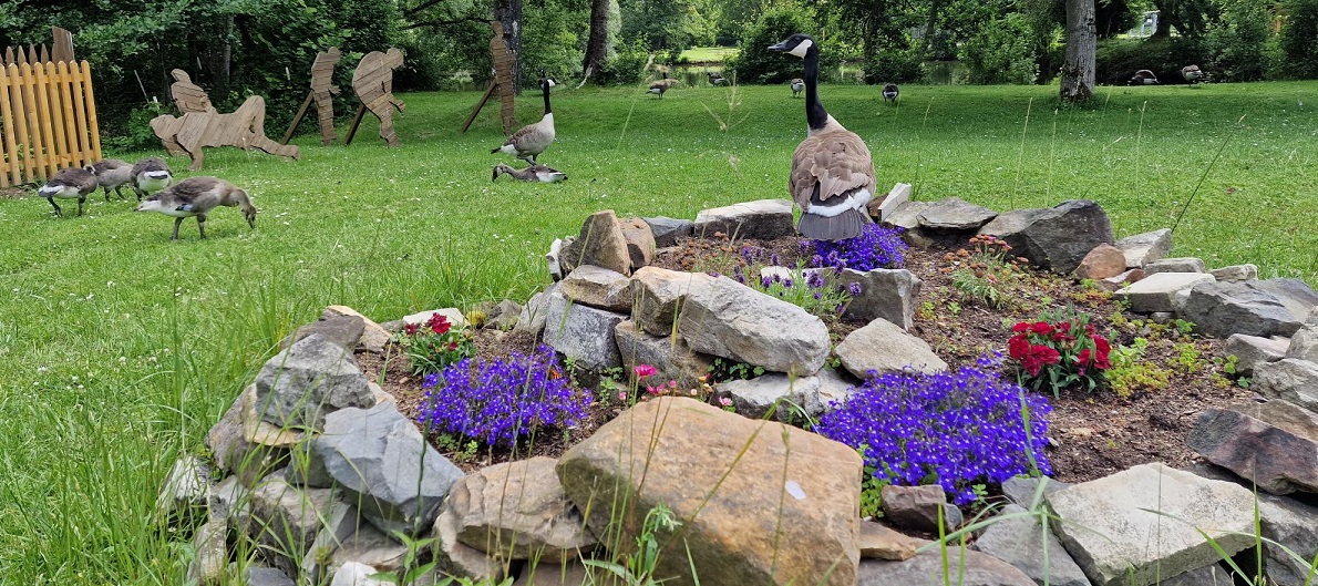 In den vergangenen Wochen wurde der Bereich unserer handlungsorientierten Gruppe “Garten, Natur und Umwelt” intensiv “beackert”. Neue Beete, wie das oben zu sehende mit Natursteinen eingefasste, bereichern den Garten der GNU-Gruppe. Hier fühlen sich nicht nur die Kanada-Gänse wohl…