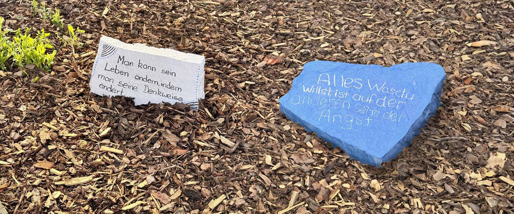Ein Projekt der Bezugsgruppe L1, welches unter der Leitung von Ergotherapeutin S. Lahnstein stattfand, ist nun rund um unser Haus Mühlental in Wied zu bestauen: motiverende Botschaften, die zum Nach- und Weiterdenken anregen, finden sich zwischen Sträuchern, Hecken, Bäumen und Blumen in den Beeten und Außenanlagen der Klinik. Im Rahmen der "Ergotherapie in der Bezugsgruppe" überlegte sich die Gruppe, wie man mit natürlichen Materialien frischen Wind auf das Klinikgelände bringen kann und kam zum Entschluss, Steine mit ausgewählten Sprüchen, Zitaten und Botschaften zu verzieren, die schnell im Vorbeigehen gelesen werden können und wohlmöglich doch in Erinnerung bleiben...