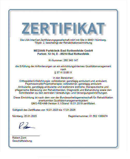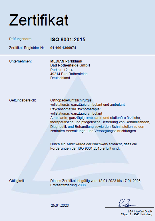 Außerdem haben wir ein strukturiertes internes Qualitätsmanagementsystem eingeführt und aktualisieren dies kontinuierlich. Alle relevanten Arbeitsabläufe und Prozesse sind festgelegt und werden überwacht. Ergänzt wird dies durch schriftliche Verfahrensanweisungen sowie ein strukturiertes Formularwesen. Im Jahr 2007 wurde das interne Qualitätsmanagementsystem erstmalig nach DIN EN ISO 9001:2000 zertifiziert. In den Jahren 2010, 2013 und 2016 erfolgten die erfolgreichen Re-Zertifizierungen nach DIN EN ISO 9001:2008 sowie den rehaspezifischen Normen DEGEMED 5.0 und QMS-Reha. Wir erfüllen damit alle Anforderungen der Bundesarbeitsgemeinschaft für Rehabilitation (BAR) zum internen Qualitätsmanagement nach § 20 Abs. 2a SGB IX. Zur Überwachung dieser Verfahren kommen jährlich Prüfer einer unabhängigen Zertifizierungsgesellschaft in unsere Klinik.