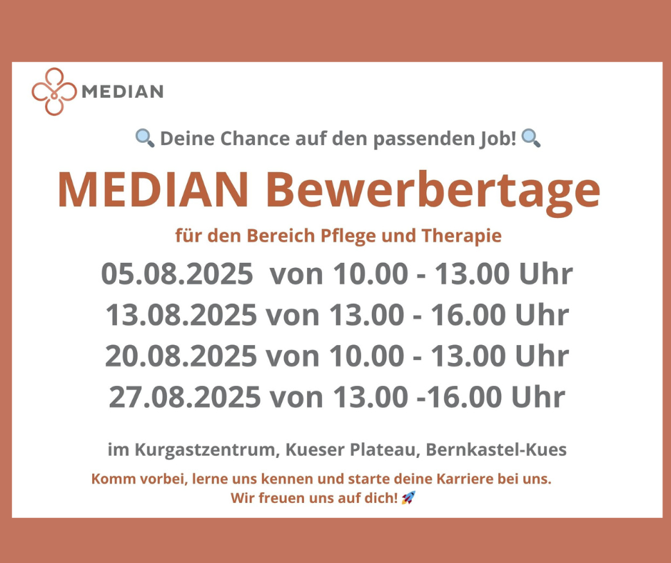 Sie möchten Teil unseres Teams werden? Dann besuchen Sie unsere MEDIAN Bewerbertage! Hier haben Sie die Möglichkeit, sich persönlich vorzustellen, unser Team kennenzulernen und mehr über unsere Kliniken zu erfahren. Wir freuen uns auf alle, die Interesse an einer Karriere in Therapie und Pflege bei MEDIAN haben!