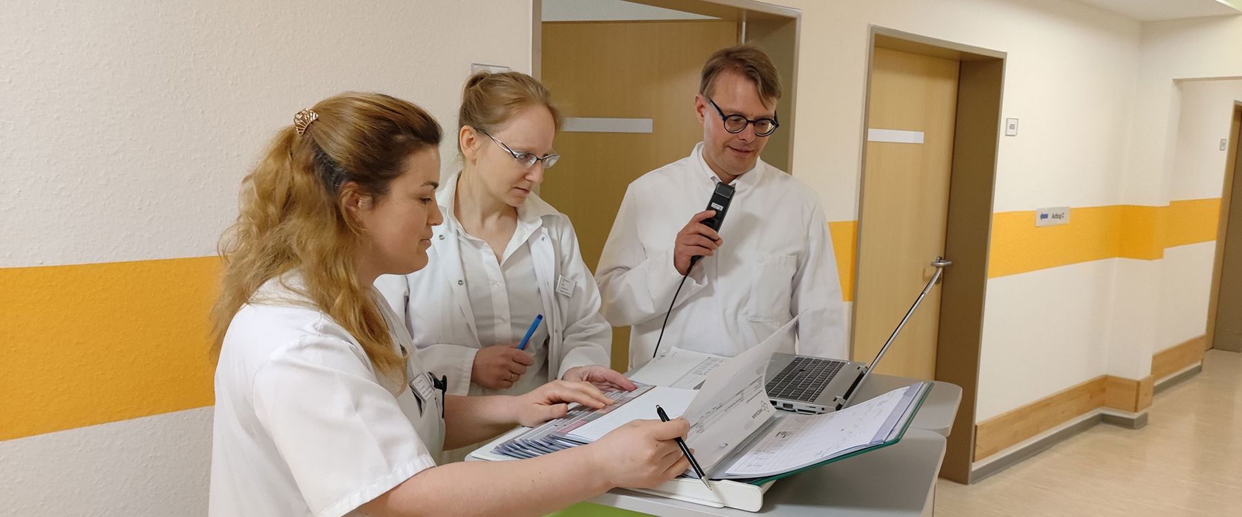 Visite bekommt digitalen Vorschub: Nach enger Zusammenarbeit des lokalen IT-Services und der zentralen Abteilung Group IT wurde in der Neurologie der MEDIAN Saale Klinik Bad Kösen II auf allen Stationen ein stabiles WLAN realisiert und die digitale Visite mit Laptop eingeführt. Diese ermöglicht es jetzt, aktuelle Dokumente wie Laborbefunde direkt in der digitalen Patientenakte (EPA) aufzurufen und Visitendiktate via Fluency Direct ins Team-Protokoll einzufügen. Nach einer kurzen Eingewöhnungszeit ist die Visite inzwischen sogar schneller als mit Papierakte und einem herkömmlichen Diktiergerät, Fehlerquellen durch manuelle Übertragungen werden dank der digitalen Tools vermieden.