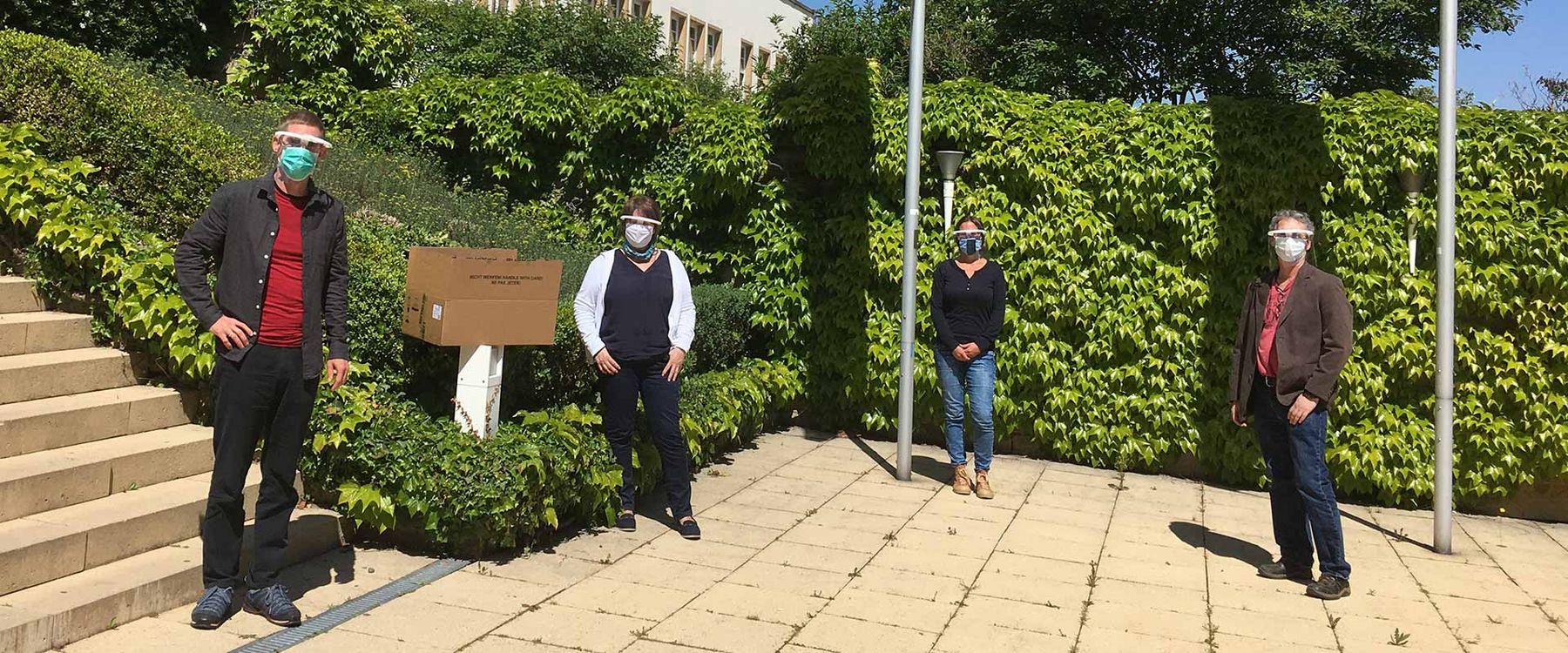 Über die Spende freuten sich bei der Übergabe am 5. Mai Gregor Chittka/Leiter MEDIAN Haus Talblick Bad Dürkheim, Nicole Vergauwe-Straub/Leiterin MEDIAN Albert-Schweizer-Haus Bad Dürkheim, Annemarie Dauer/Leiterin MEDIAN Wohn- und Pflegeheim Pfalzstift Bad Dürkheim und Michael Glaubrecht/Leiter MEDIAN Soziotherapeutisches Zentrum Bad Dürkheim. „Die pflegerische und psychosoziale Versorgung unserer Bewohner kann nur im Face-to-Face-Kontakt erbracht werden“, so die Einrichtungs-Leiterinnen und -Leiter. „Die Face Shields von Xylem geben unseren Mitarbeitenden in Kombination mit dem obligatorischen Mund-Nasen-Schutz zusätzliche Sicherheit.“