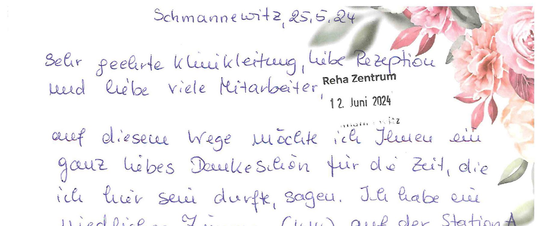 Das Zentrum für Rehabilitation Schmannewitz hat von einer zufriedenen Rehabilitandin einen Dankesbrief erhalten, den wir Ihnen nicht vorenthalten und daher im Folgenden veröffentlichen möchten. Vielen Dank für die wertschätzenden Worte!