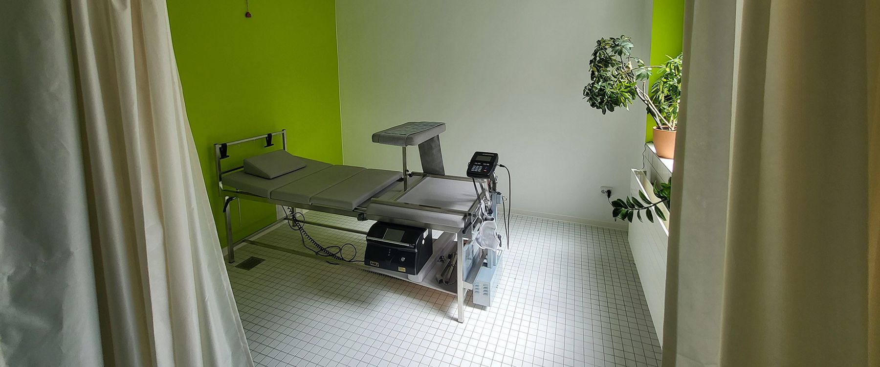 So wurde das Projekt „Elektrotherapie“ ins Leben gerufen. Aus Platzgründen war diese vor vielen Jahren von der Therapieabteilung auf die Station verlegt worden. Um die physikalischen Anwendungen jedoch besser in den Therapiealltag von den Patientinnen und Patienten sowie dem therapeutischen Team zu integrieren, wurden nun die Räumlichkeiten der ehemaligen Hydrotherapie grundlegend saniert. Die Wasserleitungen wurden zurückgebaut, die Elektrik neu verlegt, die in die Jahre gekommen Wandfliesen durch eine frische Wandgestaltung ersetzt, Einzelkabinen für elektrotherapeutische Anwendungen, Traktion und Schröpfen, wurden eingebaut.