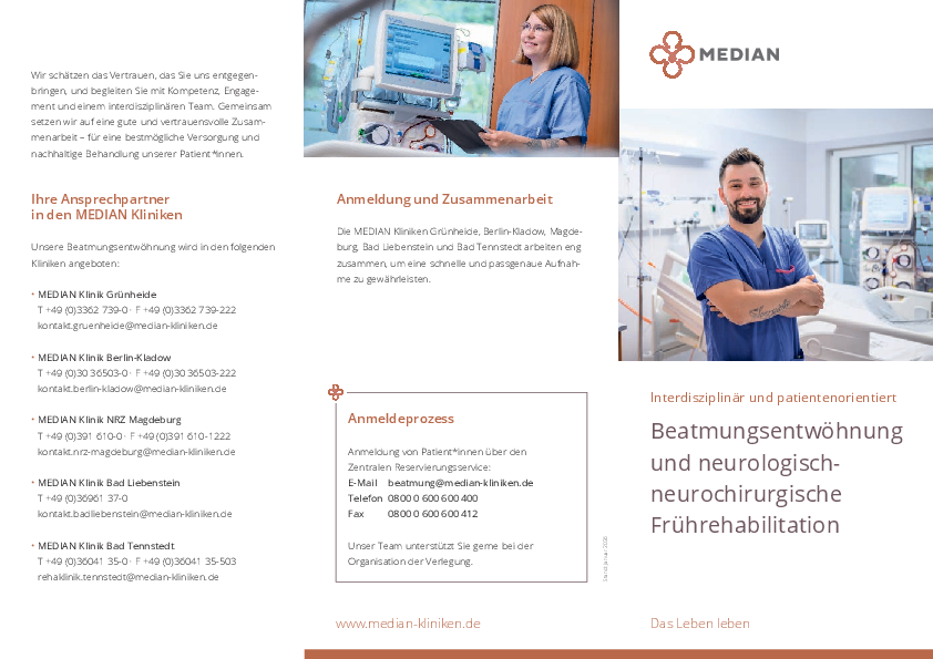 Schon während der Entwöhnung von der Beatmung werden unsere Patientinnen und Patienten durch ein interdisziplinäres Team rehabilitativ behandelt. Hierdurch wird die optimale Förderung zum frühestmöglichen Zeitpunkt gewährleistet. Zu dieser Förderung gehört auch die protokollbasierte Entwöhnung von der Trachealkanüle. Die Entwöhnung von der Beatmung und der Trachealkanüle wird durch ein individualisiertes Sekretmanagement gefördert. Nicht von der Beatmung oder der Trachealkanüle entwöhnbare Patienten werden so behandelt, dass sie ein langfristig möglichst geringes Komplikationsrisiko haben. Übergeordnetes Ziel der neurologischen Früherehabilitation beatmeter und trachealkanülierter Patientinnen und Patienten ist die bestmögliche Lebensqualität und Teilhabe.