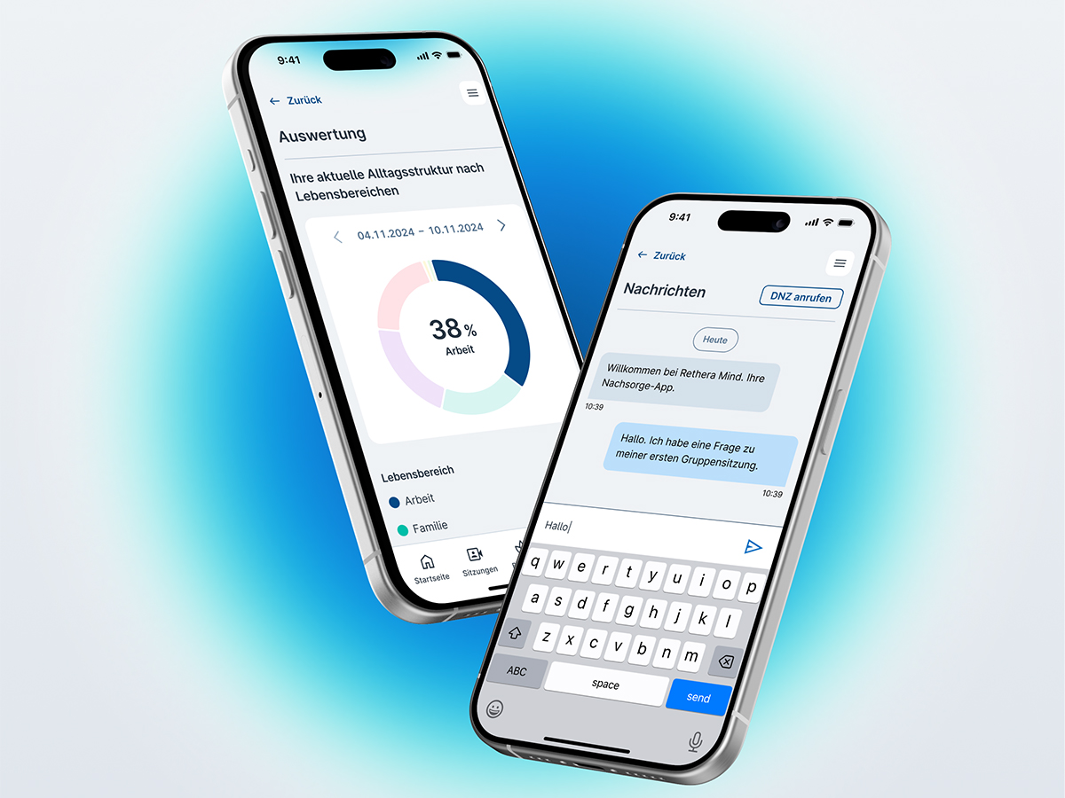 Rethera Mind ist unsere digitale Nachsorgelösung für Patientinnen und Patienten mit Depressionen, Angststörungen und somatoformen Erkrankungen. Rethera Mind begleitet Sie im Alltag nach Ihrer Reha und unterstützt Sie dabei, Herausforderungen zu meistern und Ihre erzielten Reha-Erfolge nachhaltig aufrecht zu erhalten.