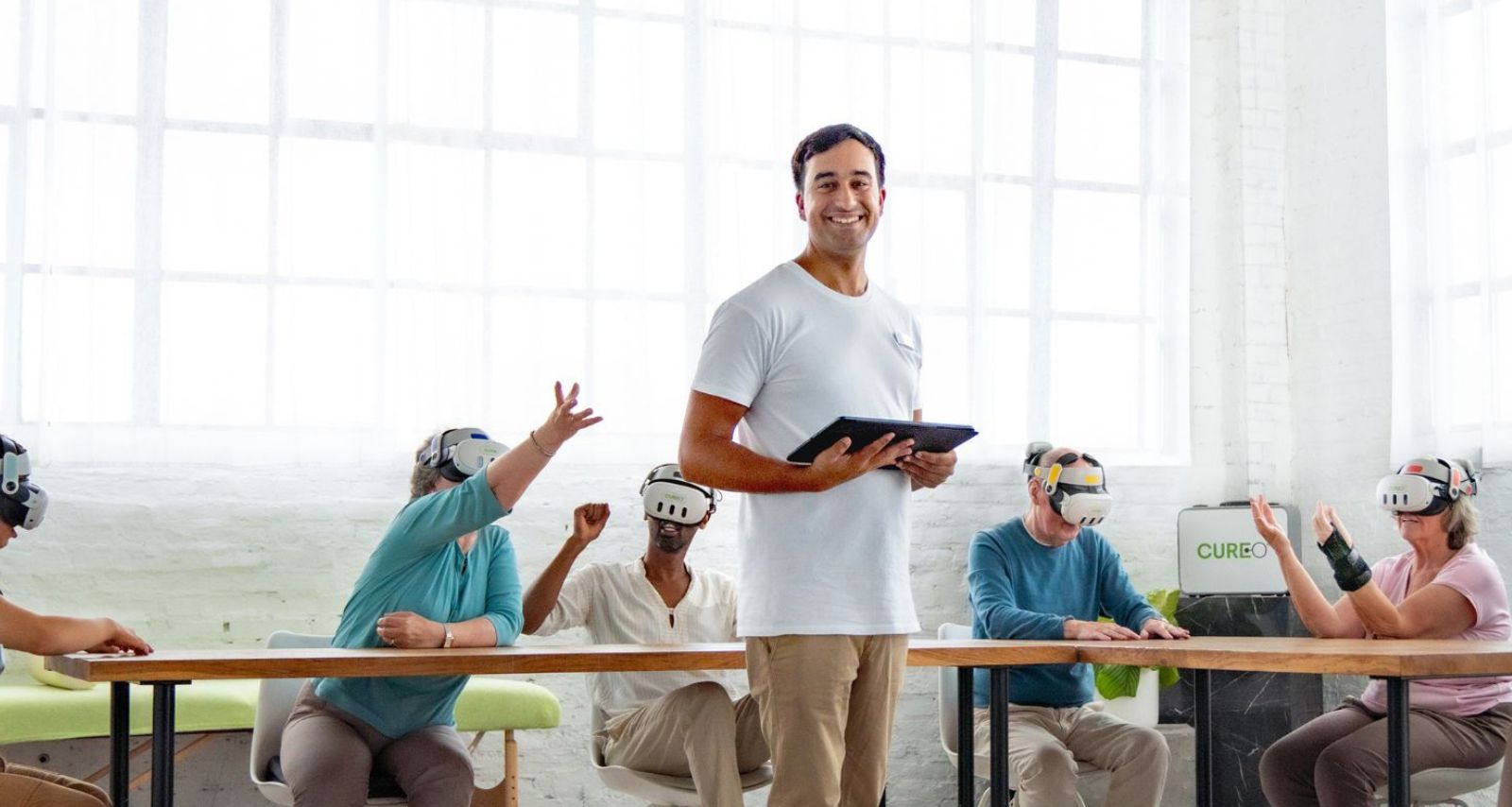 Zwischen Januar und August 2025 wurde das VR-Therapiesystem Cureo (von der Cureosity GmbH) als innovative Ergänzung zur Standardtherapie der Ergotherapie und Neuropsychologie in der Neurorehabilitation getestet. Die Technologie ermöglicht ein spielerisches Training motorischer und kognitiver Funktionen: Patient*innen zerplatzen virtuelle Bälle, spielen Instrumente oder üben alltagsnahe Handlungen wie das Zubereiten einer Mahlzeit – in einer sicheren, immersiven Umgebung.