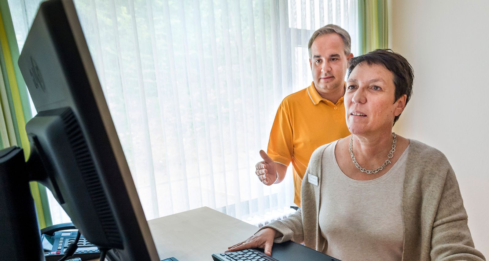 Eine Frau zeigt einer anderen Frau etwas auf dem Monitor