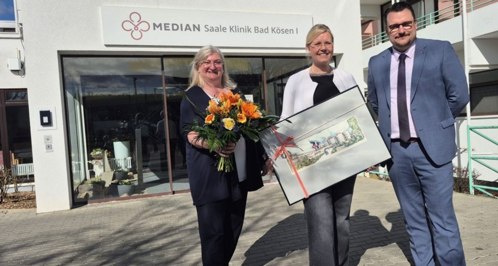 „Kerstin Budde-Große übergibt die Position der Kaufmännischen Leitung in der MEDIAN Klinik Bad Kösen I nach 30 Jahren ihrer alleinigen Führung der beiden Standorte Bad Kösen I und II, an Lisa-Marie Kühnert. Für ihr kontinuierliches Engagement, ihre Beständigkeit und ihren Einsatz für die Patientinnen und Patienten danken wir Frau Budde-Große ausdrücklich und freuen uns sehr, dass sie uns als langjährige Kollegin und Mitglied im Führungs-Team erhalten bleibt.“