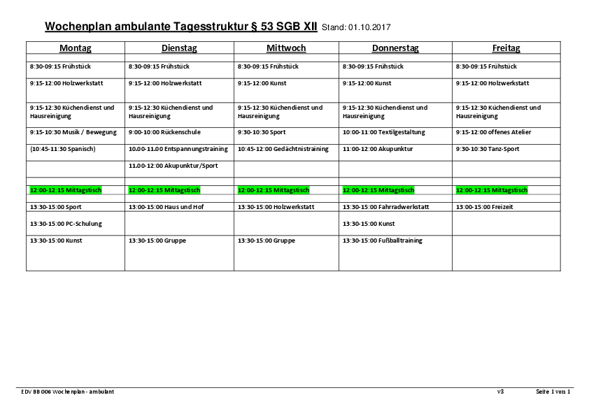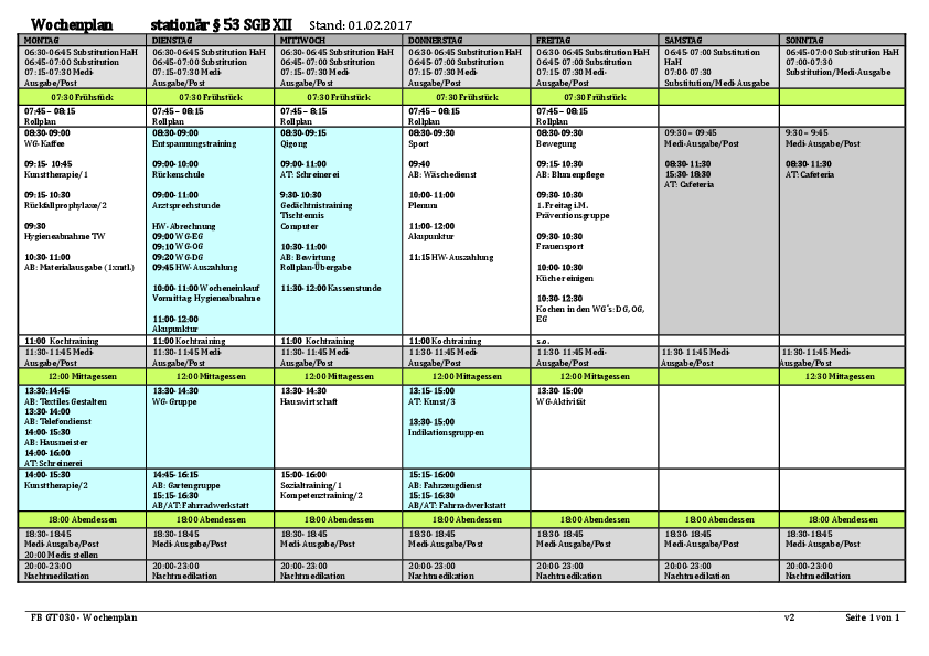Um Ihnen einen Eindruck zu vermitteln, wie ein Tag bei uns im MEDIAN Therapiezentrum Haus Willich aussieht und wie sich der Alltag gestaltet, haben wir Ihnen jeweils einen Wochenplan zur Orientierung hinterlegt: